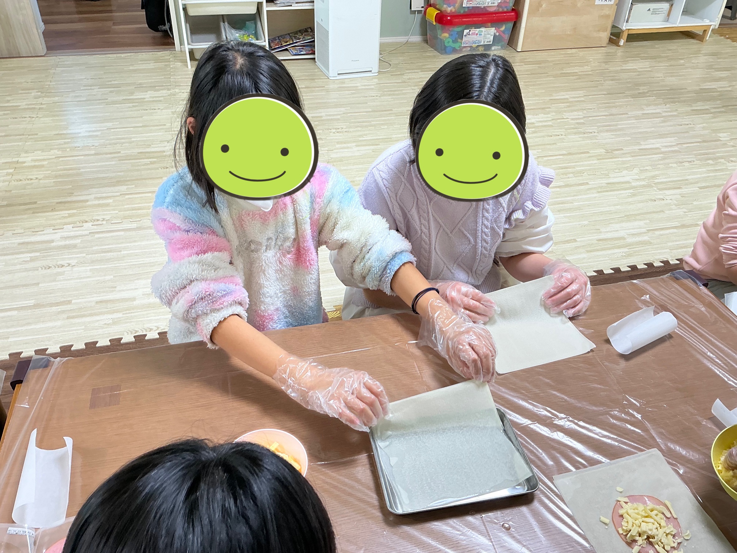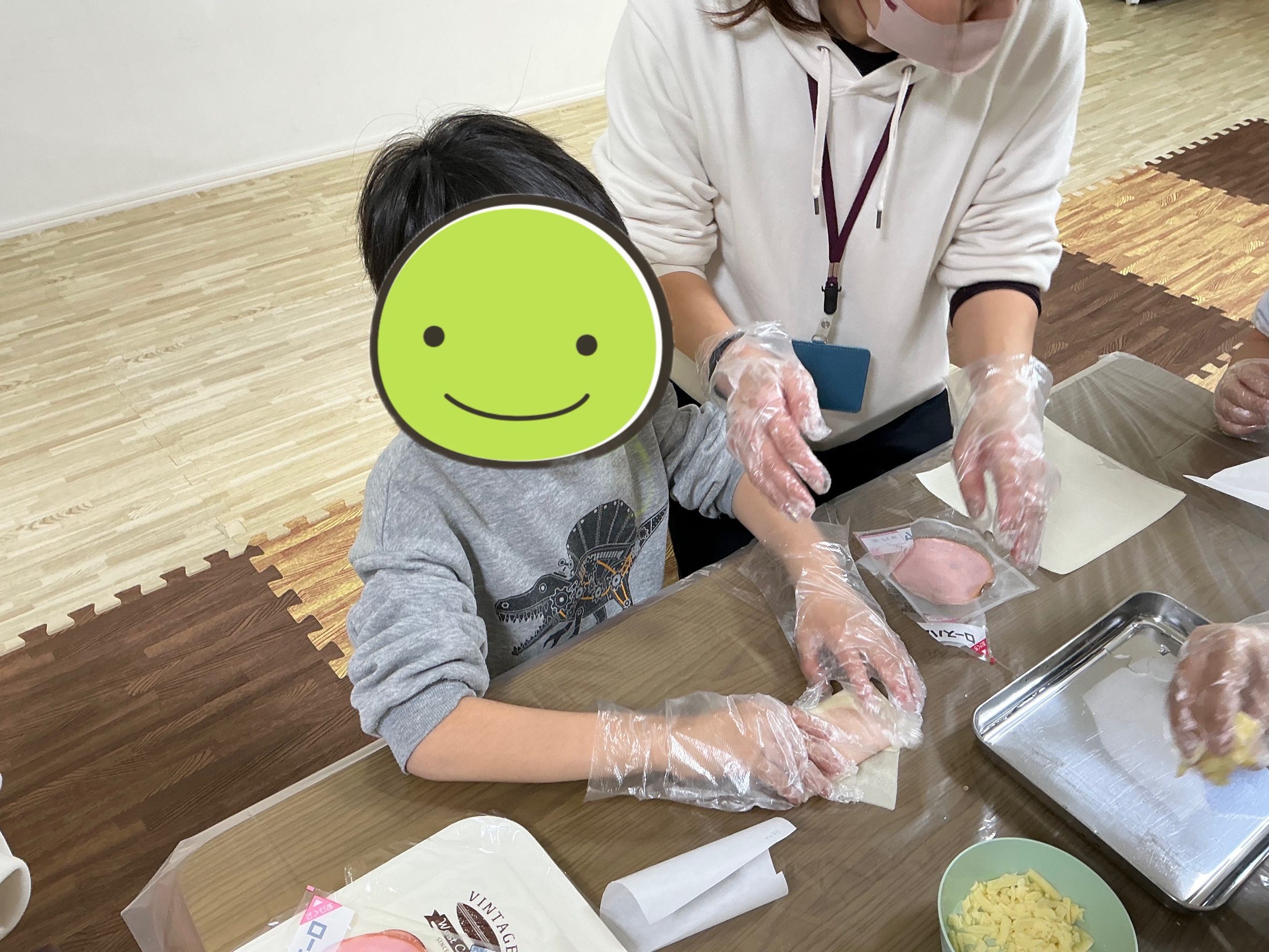 春巻きの皮にハムとチーズをのせて、くるくると巻いていきます。チーズがパラパラしていて巻くのは少し難しかったのですが、お手本を良く見て作っていた子どもたち。「上手に巻けたよ!」と嬉しそうに見せてくれていました。巻き終わったら電子レンジでチンするだけで、あっという間に完成です。