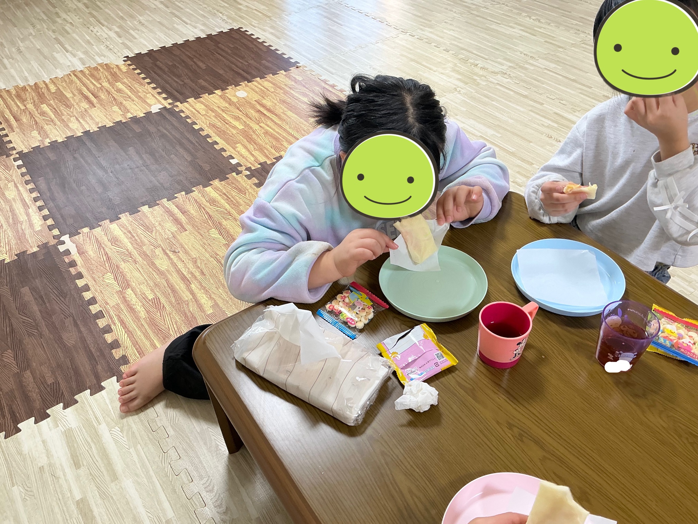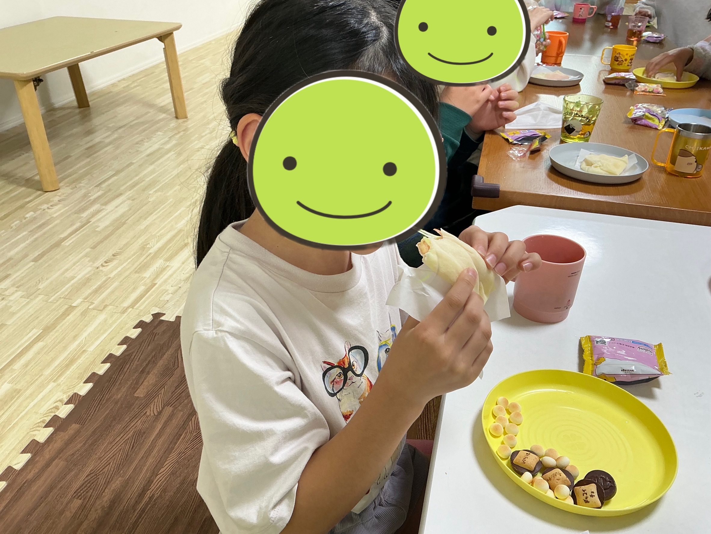 チーズがとろ〜り溶けた出来たてのブリトーを食べて「おいしい!」「もっと食べたい!」と大好評でした。自分で作ったおやつは格別の味だったようで、みんなニコニコ笑顔で完食していました。簡単で楽しいクッキング、大成功です!