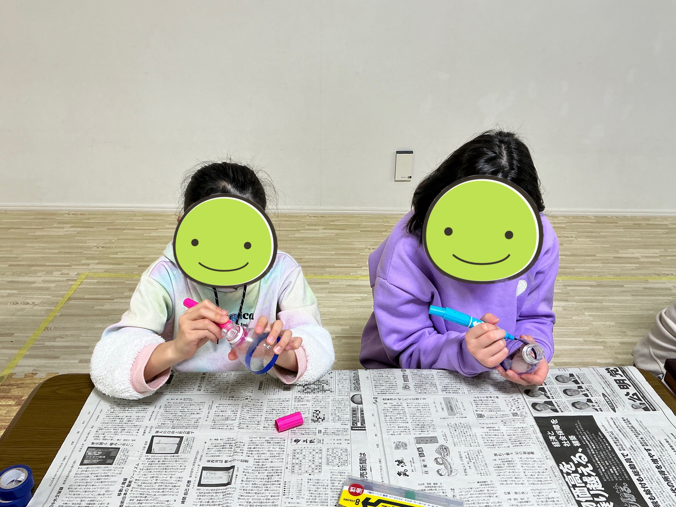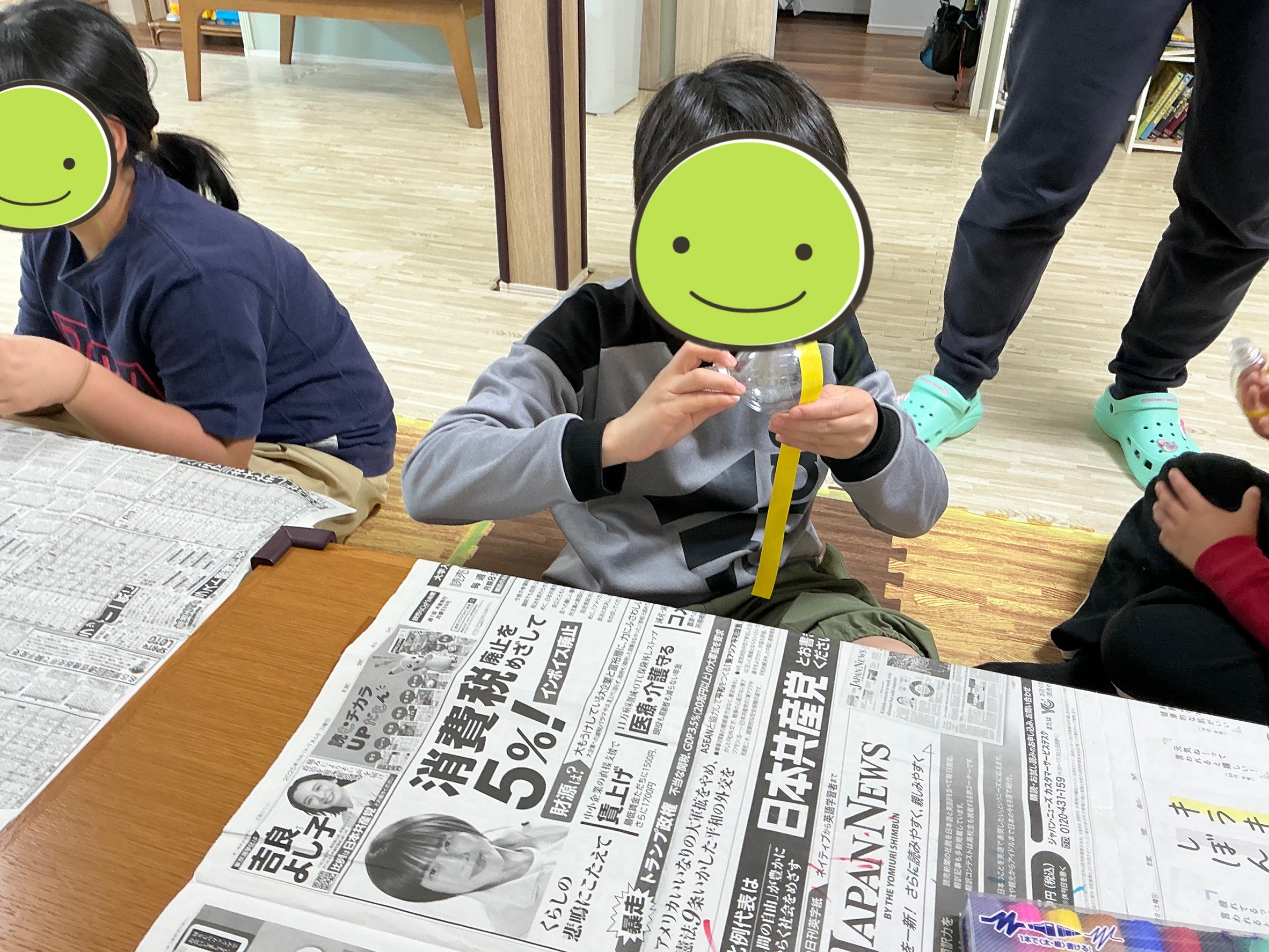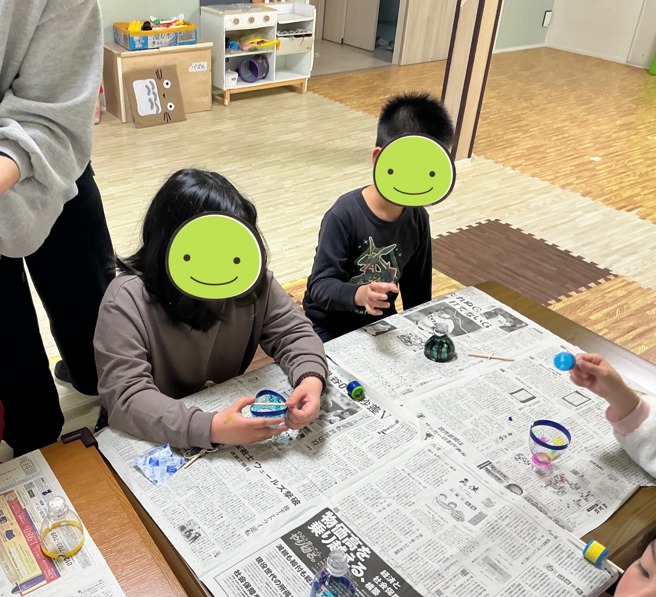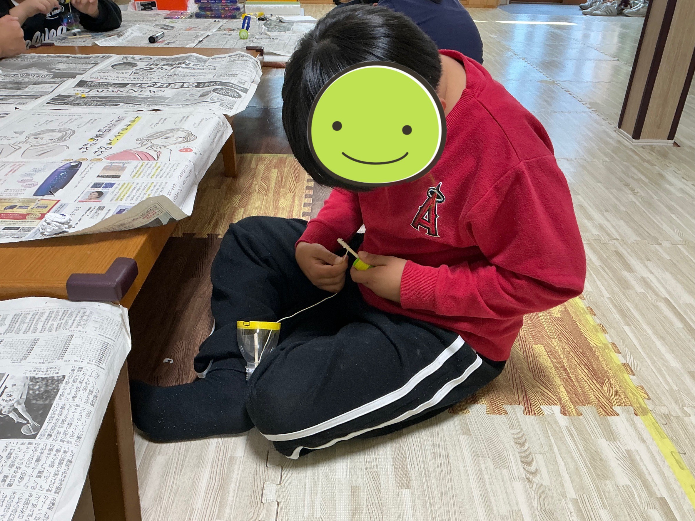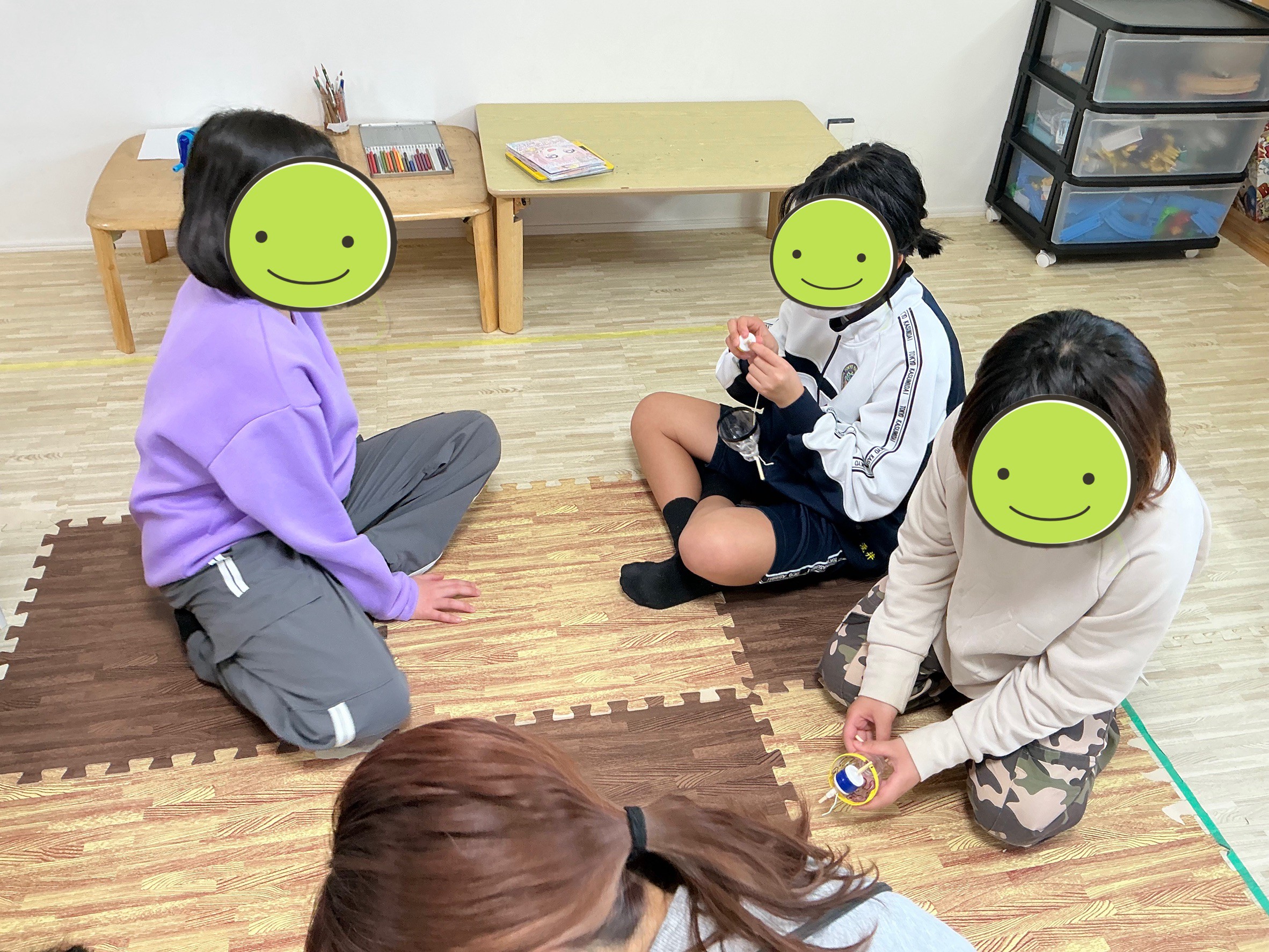 今回は500mlのペットボトルを使ったベイブレード風こま作りを行いました!難しい場面では自分から職員に声をかけて一緒に考え最後まで完成させる事が出来ていました。困った時に助けを求める力もとても大切です。完成後は友だちと回し合い、勝負をしたりして楽しみました。